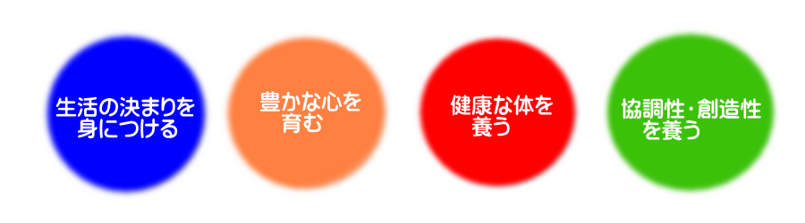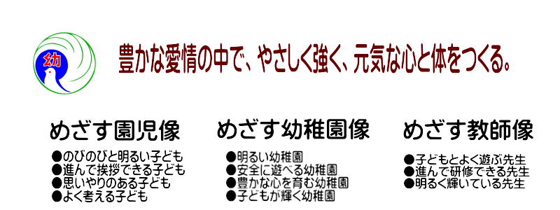 教育目標 幼児期は人間の一生にとって人格形成の基礎がつくられる一番大切なときです。友だちと一緒に様々な遊びを通して、子どもたちが自己を発揮し健やかな成長をして、自主性や創造性豊かな情操を育む教育をめざしています。